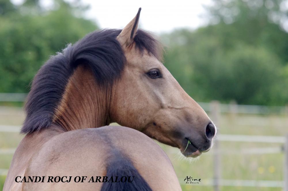 Candi Roc J Arbalou possède de superbes allures, un très beau modèle, il est très sociable en troupeau et avec l'homme et a une tête très racée. Du sang , un excellent coup de saut et de la force feront de Candi Rocj un futur très bon compétiteur. Depuis sa vente Candi Rocj Arbalou enchaine les sans faute avec son jeune cavalier.