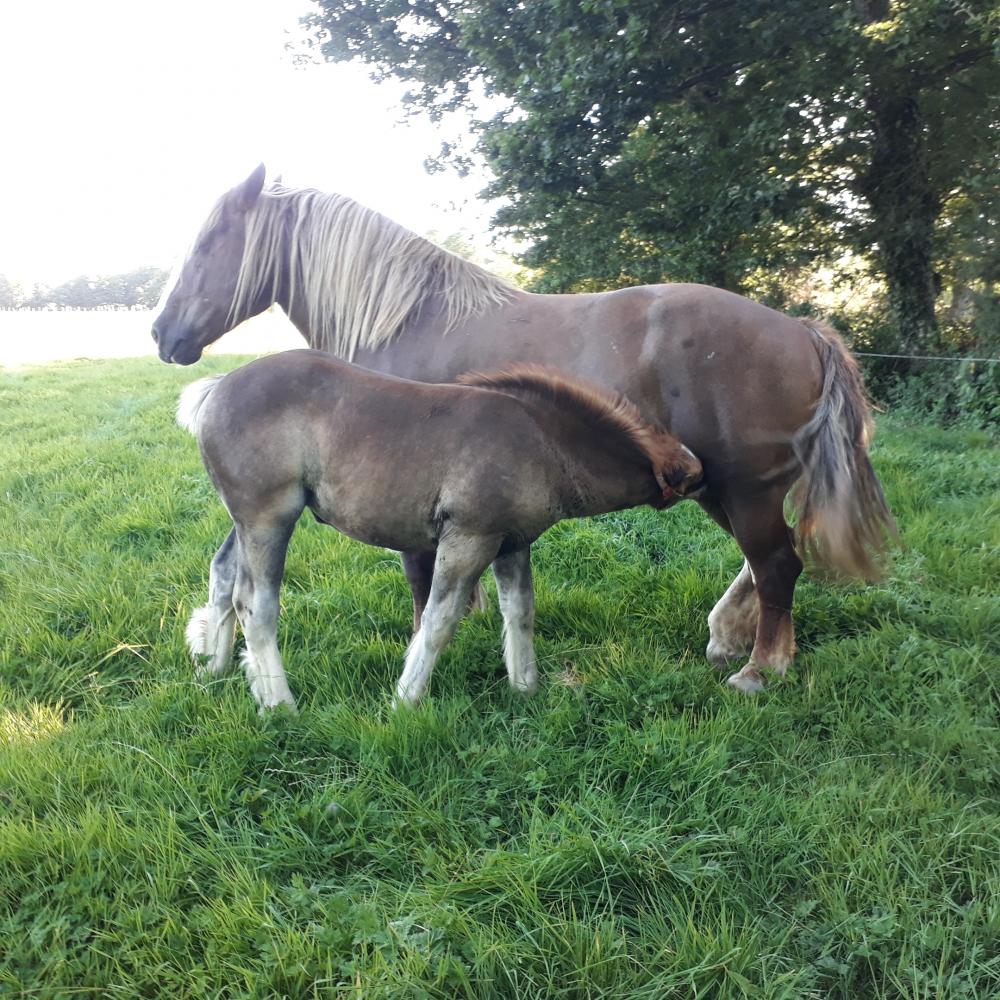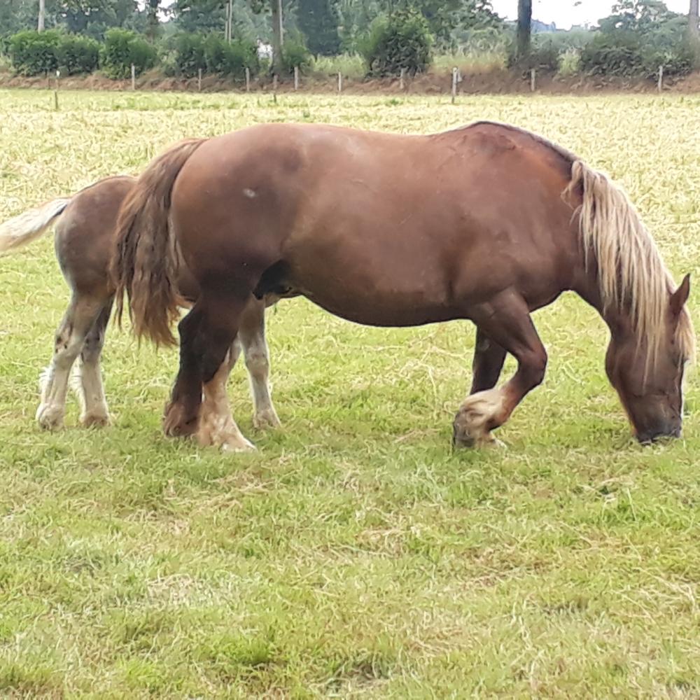 Mère à vendre également pour élevage, poulinière trait petite taille ramassée mais qui se déplace et de type postière. Cinquième poulain.